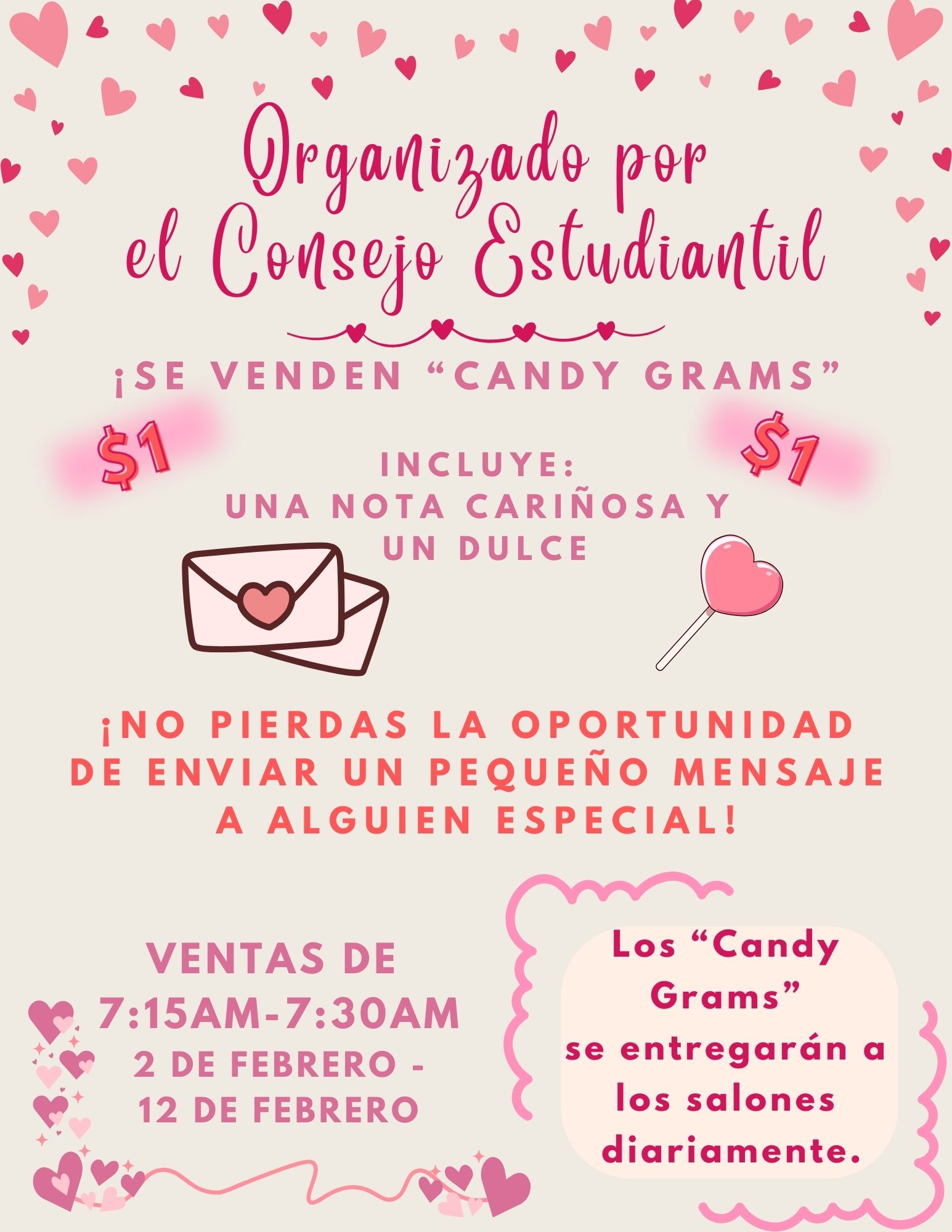 Del 2 al 12 de febrero, los estudiantes podrán comprar Candy Grams por solo $1 durante la llegada, de 7:15 a 7:30 AM.